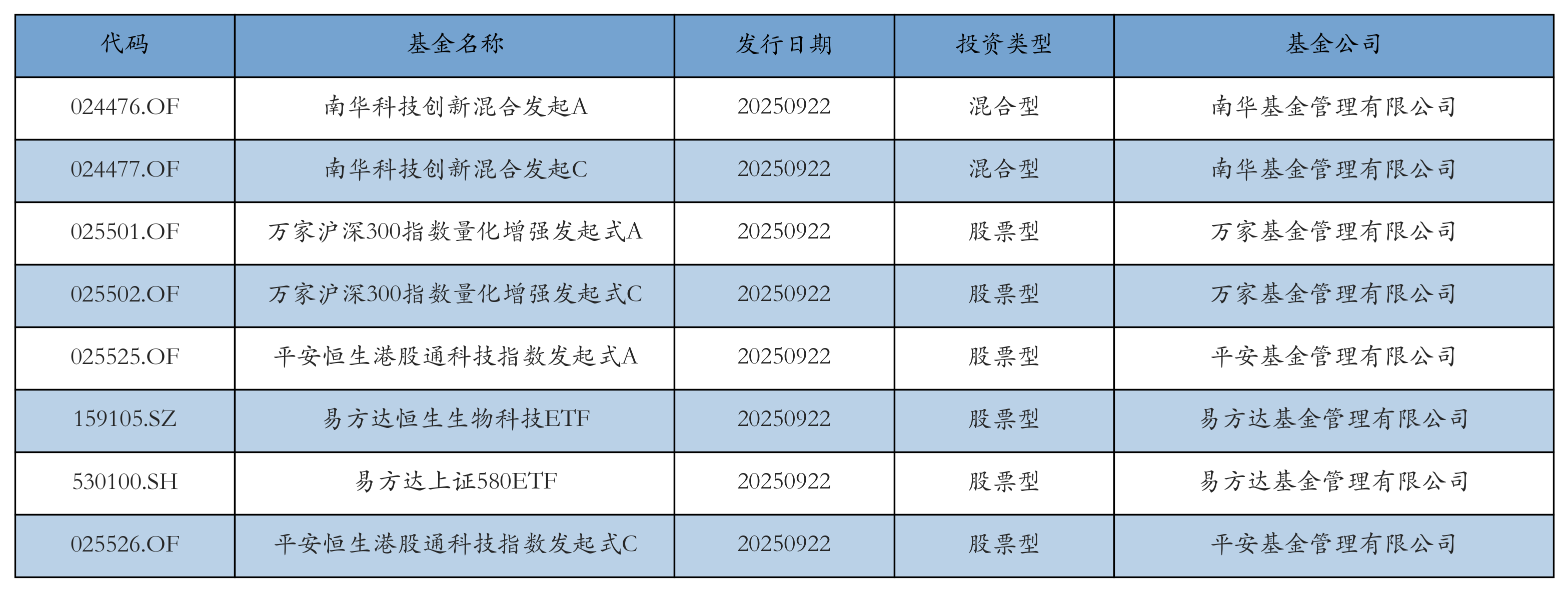 昨日有8只新基金发行,分别为:南华科技创新混合发起A、南华科技创新混合发起C、万家沪深300指数量化增强发起式A、万家沪深300指数量化增强发起式C、平安恒生港股通科技指数发起式A、易方达恒生生物科技ETF、易方达上证580ETF、平安恒生港股通科技指数发起式C,详情见下表: